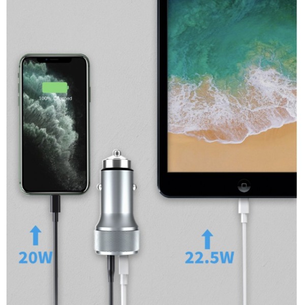 - Vysoký výkon: Táto nabíjačka do auta je vybavená dvoma portami, z ktorých jeden ponúka rýchle nabíjanie USB-A 22,5 W a druhý USB-C 20 W, čo znamená, že môžete nabíjať dve zariadenia súčasne maximálnou rýchlosťou. Či už máte smartfón, tablet alebo iné elektronické zariadenie, táto nabíjačka vás nedostane do situácie, keď sa vám vybije batéria.