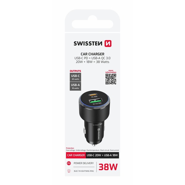 Krytoland pouzdra a kryty na mobil > Príslušenstvo pre automobily > Nabíjačky do auta > ADAPTÉR SWISSTEN CL USB-C PD + USB-A, 38W ČIERNY
