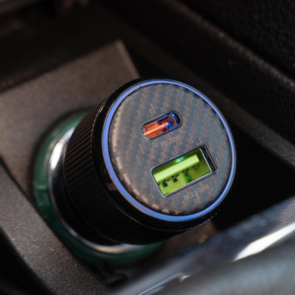 Výkonná a kompaktná nabíjačka do auta s podporou rýchleho nabíjania PD 3.0 a QC 3.0. Vďaka kombinácii portov USB-C a USB-A dokáže rýchlo a bezpečne nabíjať až dve zariadenia súčasne. Modré LED osvetlenie v obvode nabíjačky uľahčuje pripojenie kábla aj počas jazdy v noci.