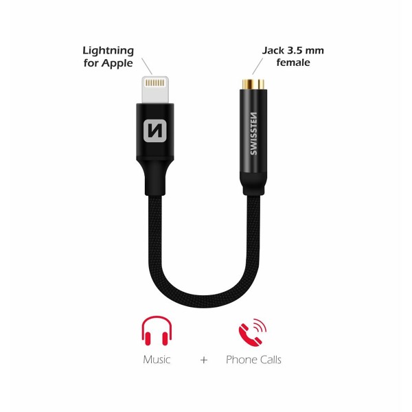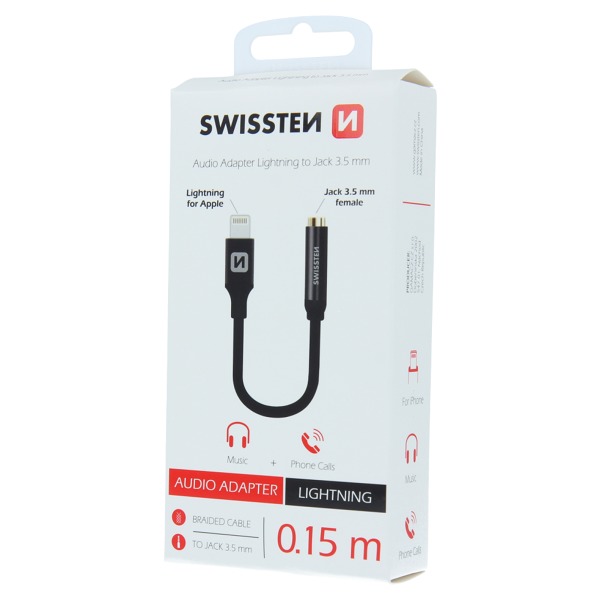 Audio adaptér Lightning/3,5 mm jack na pripojenie slúchadiel k telefónu iPhone 7 alebo novšiemu. Balené v blistrovom balení SWISSTEN