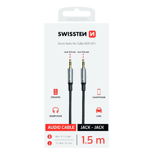 Krytoland pouzdra a kryty na mobil >  Príslušenstvo pre mobilné telefóny >  Káble >  Káble AUX > AUDIO KÁBEL SWISSTEN TEXTILE JACK (samec) / JACK (samec) 1,5 M BLACK (nahrádza 73501101)
