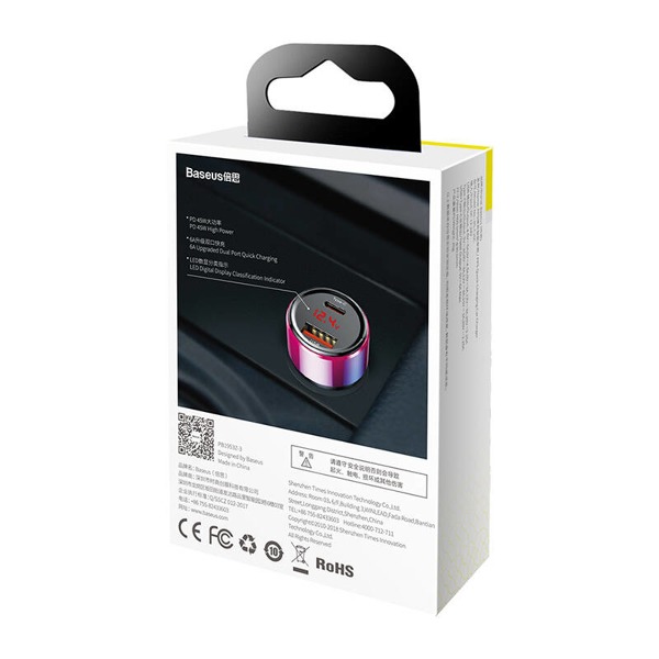 S nabíjačkou do auta Baseus môžete nabíjať svoje zariadenia výkonom 45 W bez obáv z poškodenia zariadenia. Podporuje typy rýchleho nabíjania, ako sú QC 4.0 /3.0/2.0, PPS, PD 3.0, SCP, FCP, AFC, MTK PE, čo vám umožňuje rýchlo nabíjať dve zariadenia súčasne.