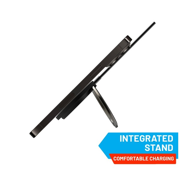 Vylepšená verzia obľúbenej bezdrôtovej nabíjačky v novom dizajne s kovovým výklopným stojanom je určená špeciálne pre iPhone 12 a vyššie s podporou MagSafe. Integrované magnety bezpečne pripevnia nabíjačku k telu telefónu a uľahčujú manipuláciu počas nabíjania. Vďaka technológii Qi možno nabíjať smartfóny iných značiek s výkonom až 15 W (7,5 W pre iPhone). Nabíjanie sa spustí okamžite po pripevnení nabíjačky k zadnej strane telefónu, pred poškriabaním ju chráni mäkký silikónový povrch nabíjačky. Priložený 1,2 m kábel je na pripojenie k nabíjaciemu adaptéru zakončený konektorom USB-C. Vďaka stojanu z odolnej brúsenej zliatiny môžete telefón počas nabíjania postaviť do horizontálnej alebo vertikálnej polohy. Štíhle telo nabíjačky dokonale ladí so zadnou stranou telefónu.
