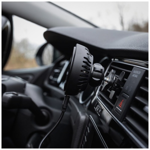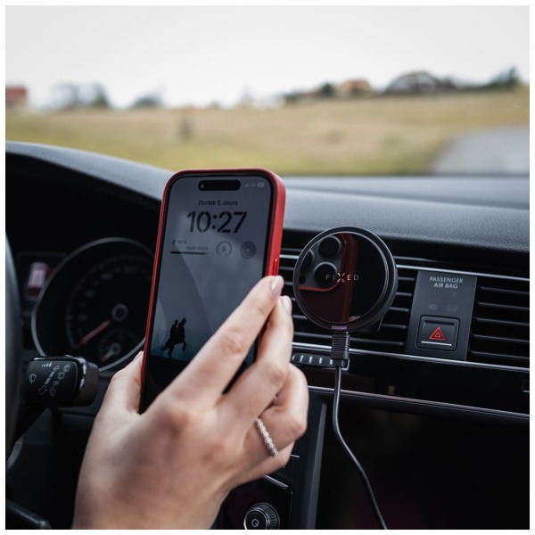 Držiak FIXED MagCool s bezdrôtovým nabíjaním a aktívnym chladením je jedinečné riešenie, ktoré zabraňuje prehrievaniu pripojeného zariadenia. Chladenie telefónu zabezpečuje ventilátor na zadnej strane držiaka spolu s Peltierovým článkom, ktorý odoberá teplo na strane pripevnenia telefónu a odvádza ho na druhú stranu držiaka. Telefón môžete jednoducho pripevniť jednoduchým priložením k hlave držiaka, kde sa nachádzajú integrované magnety MagSafe, ktoré sa pripájajú ku kompatibilným telefónom iPhone radu 12 a vyššie, čím zabezpečujú stabilné pripevnenie telefónu počas celej jazdy. Stabilné pripevnenie je zaručené aj pre telefóny, ktoré sú vybavené krytom MagSafe. Po pripevnení sa okamžite spustí nabíjanie a telefón sa spoľahlivo dobije výkonom až 15 W (iOS max. 7,5 W). Vyvýšený povrch držiaka je navrhnutý tak, aby nadväzoval na magnety MagSafe v telefóne a nezasahoval do oblasti fotoaparátu, takže nehrozí poškriabanie ani neúplné prichytenie. Držiak sa ľahko inštaluje do akéhokoľvek ventilačného otvoru v aute pomocou klieští s reverzným háčikom, ktorý sa prichytí na lamelu ventilačného otvoru a zabráni vypadnutiu držiaka. Pre pohodlnú a bezpečnú jazdu možno otočný kĺb držiaka ľahko nastaviť jednou rukou pre dosiahnutie najlepšieho pozorovacieho uhla. Majte svoj telefón vždy pripravený na použitie, aj v tých najparnejších dňoch, v blízkosti vyhrievania auta alebo pri vysokom výkone zariadenia.