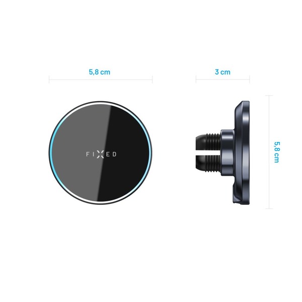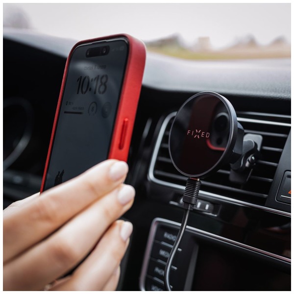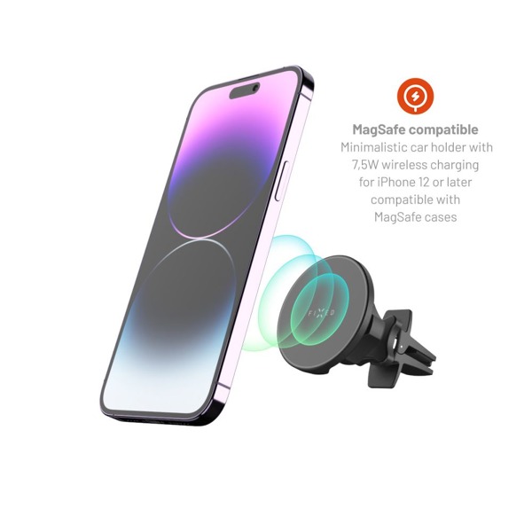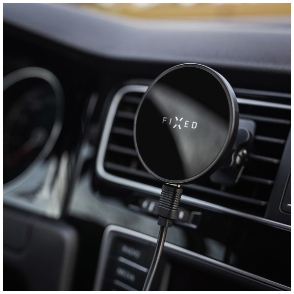 Magnetický držiak FIXED MagRound s podporou bezdrôtového nabíjania je určený pre telefóny iPhone s technológiou MagSafe. Jednoduchým priložením k povrchu držiaka sa magnety MagSafe pripevnia k telefónu a okamžite sa začnú nabíjať. Povrch držiaka kopíruje rozloženie magnetov MagSafe v telefónoch iPhone a nezasahuje do oblasti fotoaparátu, takže nehrozí poškriabanie ani neúplné priľnutie. To zaručuje pevné uchytenie zariadenia aj pri väčších nárazoch pri jazde, a to aj v prípade, že je vybavené krytom MagSafe. Telefón sa zároveň rýchlo nabíja výkonom až 15 W (max. 7,5 W pre iOS). Držiak sa ľahko inštaluje do akéhokoľvek ventilačného otvoru v aute pomocou klieští s reverzným háčikom, ktorý sa prichytí na lamelu ventilačného otvoru a zabráni vypadnutiu držiaka. Pre pohodlnú a bezpečnú jazdu možno otočný kĺb držiaka ľahko nastaviť jednou rukou, aby poskytoval najlepší uhol pohľadu. Minimalistické rozmery a kovové telo v čiernej farbe zabezpečia, že sa držiak stane dizajnovým prvkom interiéru vozidla, jeho vzhľad ešte dopĺňa decentné LED osvetlenie po obvode držiaka. So štýlovým držiakom FIXED MagRound budete mať telefón vždy po ruke a vždy plne nabitý, takže vaše cesty budú len hračkou.