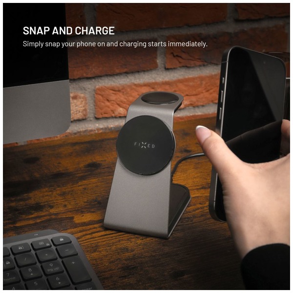Bezdrôtový nabíjací stojan FIXED MagPowerstation Alu 2 je elegantné a funkčné riešenie na každodenné nabíjanie až troch zariadení súčasne. Umožňuje vám pohodlne nabíjať telefón s podporou MagSafe, bezdrôtové slúchadlá a inteligentné hodinky na jednom mieste. Jednoducho položte telefón na oválnu nabíjaciu plochu, kde sa vďaka silným magnetom automaticky pripevní a spustí bezdrôtové nabíjanie s výkonom až 15 W. Hlavná plocha využíva najnovšiu technológiu Qi2, ktorá zabezpečuje rýchle a efektívne nabíjanie. Druhá nabíjacia plocha je určená pre AirPods alebo iné bezdrôtové slúchadlá, ktoré sa nabíjajú výkonom 3,5 W, zatiaľ čo tretia slúži na nabíjanie hodiniek Apple Watch výkonom 2,5 W. Všetky nabíjacie plochy sú potiahnuté mäkkým silikónovým povrchom, ktorý chráni zariadenie pred poškriabaním. Protišmykové podložky na spodnej strane potom zaisťujú stabilitu stojana na rôznych typoch povrchov. Napájanie prebieha cez konektor USB-C a na dosiahnutie plného výkonu sa odporúča používať nabíjací adaptér s výkonom aspoň 30 W PD 3.0 (adaptér nie je súčasťou balenia).