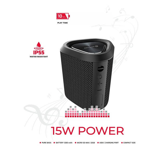 SWISSTEN SPECTRUM je dokonalý kompaktný spoločník na vaše dobrodružstvá. Jeho robustná konštrukcia odolná voči striekajúcej vode znamená, že si ho môžete vziať na akúkoľvek párty, od bazéna až po kemp. Zvýšte hlasitosť a zažite hudbu ako nikdy predtým so zvukom, ktorý naplní priestor a podmaní si vaše zmysly. Či už ste milovník hudby, outdoorový nadšenec alebo jednoducho niekto, kto miluje skvelé melódie, reproduktor SWISSTEN SPECTRUM pozdvihne váš zážitok z počúvania.
