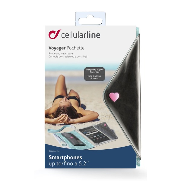 Všestranné puzdro Cellularline Voyager Pochette je praktickou kombináciou vodotesného puzdra a peňaženky, ideálnym doplnkom na letnú dovolenku. Poskytne dostatok priestoru pre telefón s veľkosťou do 5,2'' a bezpečne ho ochráni pred všetkými nástrahami letnej dovolenky pri mori. Je odolné voči striekajúcej vode (certifikát IPX4), piesku a slnečnému žiareniu. Dotykový displej vloženého telefónu môžete pohodlne ovládať cez priehľadnú stenu puzdra. Vnútorná časť puzdra ponúka uzatvárateľnú priehradku na kreditné karty a bankovky a patentné vrecko na mince a iné drobnosti. Na jednoduché prenášanie je puzdro Voyager Pochette vybavené zapínaním na patentku a pútkom na zápästie.