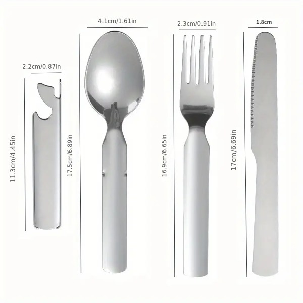 Kompaktná, odolná a praktická sada príborov z nehrdzavejúcej ocele ideálna pre všetkých cestovateľov, kempujúcich a outdoorových nadšencov. Táto štvordielna súprava obsahuje nôž, vidličku, lyžicu a multifunkčný otvárač na fľaše a konzervy - všetko, čo potrebujete na stravovanie vonku, zabalené v jednom ľahkom prenosnom puzdre.