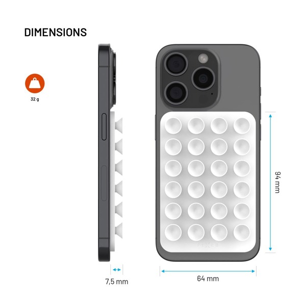 Silikónový držiak FIXED MagMate s prísavkami a upevnením MagSafe prináša jednoduchý spôsob, ako mať telefón na očiach bez toho, aby ste ho museli držať v rukách. Strana s prísavkou pevne drží na zrkadle, skle alebo inom hladkom povrchu, zatiaľ čo magnet MagSafe bezpečne pripevní iPhone 12 a novší alebo akýkoľvek telefón s puzdrom MagSafe. Vďaka tomu môžete ľahko fotografovať, natáčať videá alebo mať displej telefónu na očiach počas varenia, cvičenia alebo nanášania mejkapu. Na rozdiel od samolepiacich alternatív sa k telefónu nepripevní natrvalo, ale vďaka magnetickému pripevneniu sa dá kedykoľvek ľahko odňať. Prémiový povrch z tekutého silikónu je umývateľný, odolný a príjemný na dotyk. Vďaka ultratenkej 7 mm konštrukcii držiak splynie s telefónom a takmer nezväčšuje jeho rozmery. Minimalistický dizajn držiaka FIXED MagMate uľahčuje každodenné používanie telefónu, nech ste kdekoľvek.