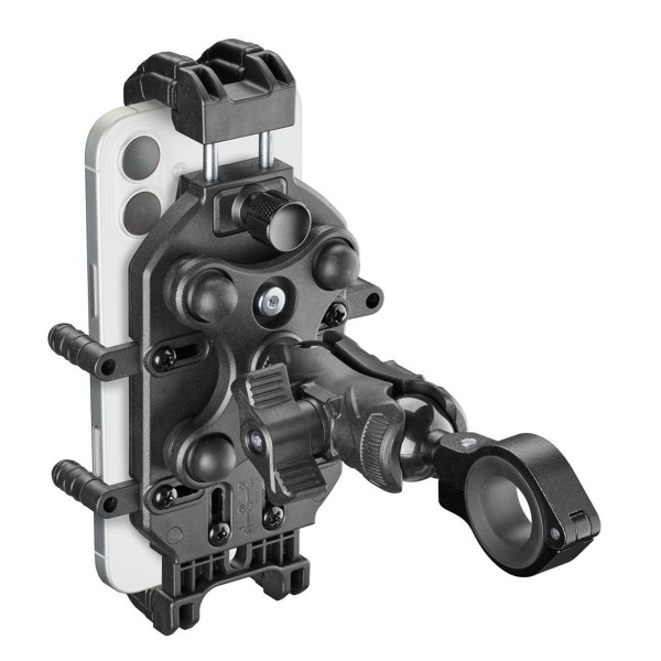 Vhodné pre akýkoľvek typ smartfónu vrátane odolných pracovných telefónov. Vďaka 8 kontaktným bodom zostane váš telefón vždy na mieste a v bezpečí. Vďaka prémiovému antivibračnému modulu sa výrazne znižujú škodlivé vibrácie prenášané na telefón. Pohyblivé horné montážne úchyty na jedinečne jednoduché upevnenie. Vďaka kĺbovému ramenu možno robustný držiak telefónu namontovať v akejkoľvek polohe na riadidlách a správne ho orientovať. Upevnenie je zabezpečené pomocou špeciálneho držiaka. Vhodné pre riadidlá s priemerom 22 až 30 mm.