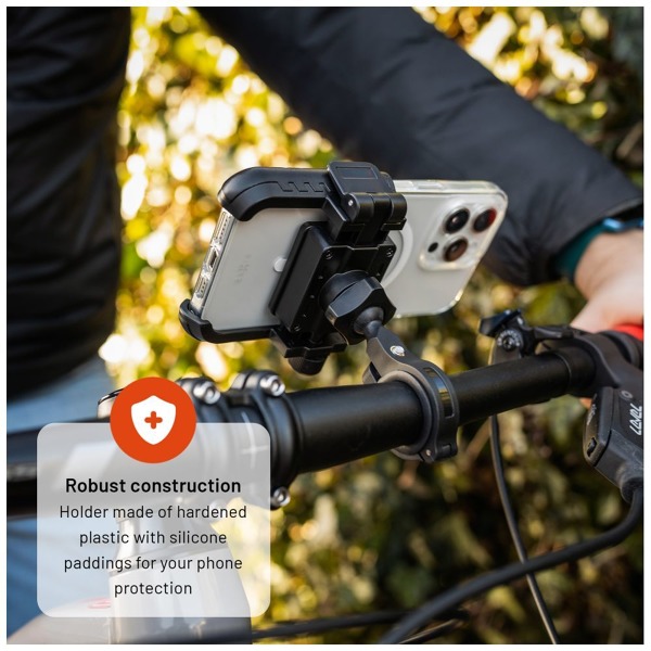 Univerzálny držiak FIXED Bikee Plus je ideálnym riešením na bezpečné používanie telefónu počas jazdy na bicykli, motorke alebo skútri. Držiak z tvrdeného plastu je vhodný pre všetky mobilné telefóny do veľkosti 6,8 palca a možno ho pripevniť na riadidlá s priemerom 20 - 32 mm. Pri prvom vložení telefónu do držiaka jednoducho nastavte optimálnu šírku upnutia otáčaním kolieska umiestneného na boku držiaka, kým telefón nebude pevne pripevnený. Táto nastavená poloha klieští zostáva zachovaná pri každom ďalšom použití držiaka a následné vkladanie alebo vyberanie telefónu sa ovláda len zaistením alebo uvoľnením bočnej páčky. Silikónové polstrovanie klieští chráni telefón pred poškodením a zabezpečuje ešte väčšiu stabilitu vloženého telefónu. Ideálny uhol pohľadu možno nastaviť pomocou otočného kĺbu. Samotný držiak sa na riadidlá pripevní jednoduchým nasadením a utiahnutím pomocou nástrojov, ktoré sú súčasťou balenia. S držiakom FIXED Bikee Plus môžete bezpečne vyraziť do mestských ulíc aj náročného lesného terénu s telefónom vždy na očiach.
