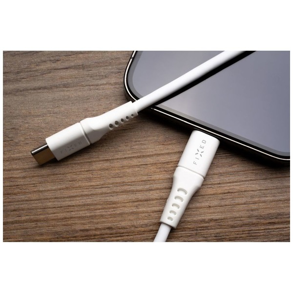 FIXED Dlhý nabíjací a dátový kábel z tekutého silikónu s konektormi USB-C/Lightning a podporou PD, 2 m, MFI, biely