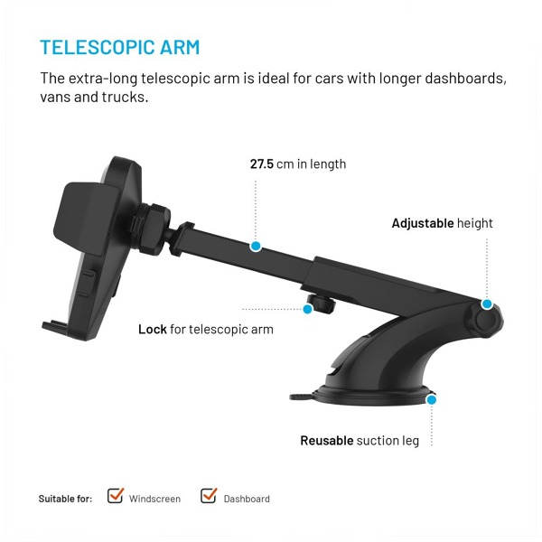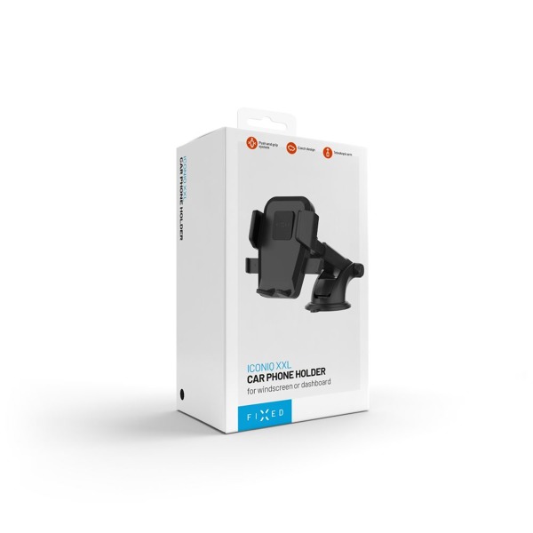 Univerzálny držiak do auta FIXED Iconiq XXL s rýchloupínacím systémom Push and Grip ponúka bezpečné a jednoduché uchytenie telefónu jednou rukou. Držiak je kompletne vyvinutý v Českej republike a ponúka tichý a plynulý mechanizmus v kombinácii s minimalistickým funkčným dizajnom. Stačí telefón zľahka pritlačiť k povrchu držiaka a bočné svorky sa automaticky prispôsobia veľkosti telefónu až do šírky 8,3 cm. Jediným stlačením sa telefón rovnako rýchlo uvoľní. Stabilitu pripevneného telefónu zospodu zaisťujú skosené podpery, ktoré nebránia prístupu k nabíjaciemu konektoru. Telo držiaka je kombináciou tvrdeného plastu a ochranných silikónových prvkov, ktoré tvoria jeden celok. Teleskopické rameno držiaka možno pripevniť k čelnému sklu alebo palubnej doske pomocou prísavnej základne, ktorá odoláva všetkým nárazom a nestráca pevnú priľnavosť ani pri opakovanom pripevnení. Teleskopické rameno s dĺžkou až 16,8 cm a nastaviteľnou výškou zabezpečuje ideálny uhol pohľadu. Organizáciu káblov uľahčujú odnímateľné úchyty na zadnej strane držiaka. S držiakom FIXED Iconiq XXL si užijete každú jazdu bez starostí.