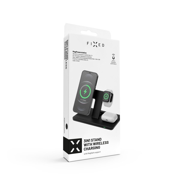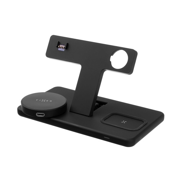 FIXED MagPowerstation 3-v-1 bezdrôtový nabíjací stojan s podporou MagSafe Mount, 15W+15W+5W, čierny