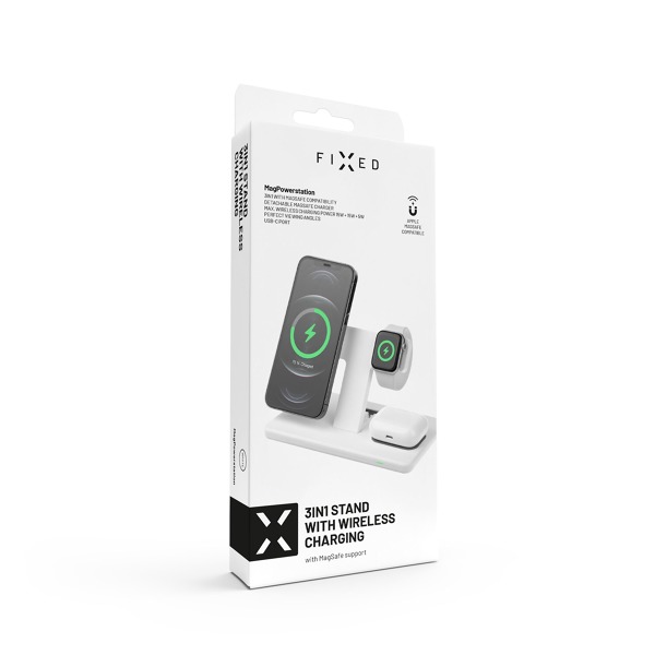 FIXED MagPowerstation 3v1 bezdrôtový nabíjací stojan s podporou MagSafe, 15W+15W+5W, biely