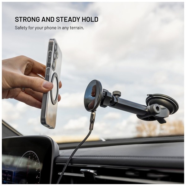 Magnetický držiak do auta FIXED MagRound 2 XL s bezdrôtovým nabíjaním spoľahlivo udrží váš telefón na mieste a zároveň ho rýchlo nabije počas jazdy. Je navrhnutý špeciálne pre telefóny iPhone s podporou MagSafe alebo pre telefóny vybavené kompatibilným krytom MagSafe. Vďaka presnému umiestneniu magnetov na povrchu držiaka stačí priložiť telefón - magnety MagSafe okamžite zacvaknú na miesto a začnú bezdrôtovo nabíjať. Držiak je vybavený najnovšou bezdrôtovou technológiou Qi2, ktorá zabezpečuje účinné a bezpečné nabíjanie s výkonom až 15 W. Magnetický povrch držiaka je navrhnutý tak, aby nezasahoval do oblasti fotoaparátu, takže nehrozí poškriabanie ani neúplné priľnutie. Držiak sa pevne pripevní k palubnej doske alebo čelnému sklu pomocou silnej prísavky, ktorá zabezpečí stabilitu aj pri jazde cez nerovnosti. Teleskopické rameno s otočným kĺbom uľahčuje nastavenie optimálnej vzdialenosti a uhla pohľadu, a to pohodlne jednou rukou pre maximálnu bezpečnosť počas jazdy. Štýlové kovové telo v čiernej farbe robí z držiaka elegantný doplnok interiéru každého vozidla. FIXED MagRound 2 XL je ideálny spoločník na cesty, ktorý udrží váš telefón bezpečne na mieste a vždy pripravený s dostatočným výkonom.