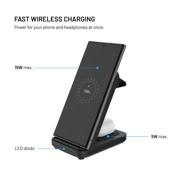 Druhá nabíjacia plocha s výkonom 5 W je ideálna pre bezdrôtové slúchadlá alebo iné