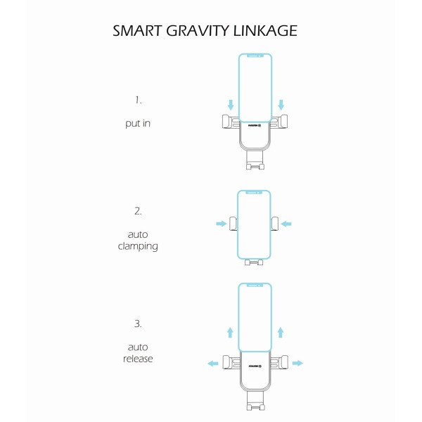 Vložením smartfónu do gravitačného držiaka dôjde vplyvom hmotnosti smartfónu k vtiahnutiu bočných čeľustí, čím sa smartfón bezpečne uchytí. Pri vyberaní smartfónu sa čeľuste uvoľnia naklonením smartfónu. Obrovskou výhodou je, že smartfón sa dá ovládať jednou rukou.