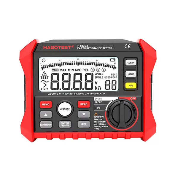 Digitálny merač zemného odporu Habotest HT2302 je špecializovaný prístroj, ktorý sa vám bude hodiť v mnohých situáciách a otestuje zemný odpor silových a rozvodných káblov alebo rôznych typov elektrických zariadení. Rozsah merania zemného odporu je od 0Ω do 4,00kΩ. Poskytuje efektívnu prevádzku prostredníctvom dvojpólového alebo trojpólového režimu. Okrem toho má veľký a prehľadný LCD displej, ktorý umožňuje efektívne odčítanie získaných informácií.