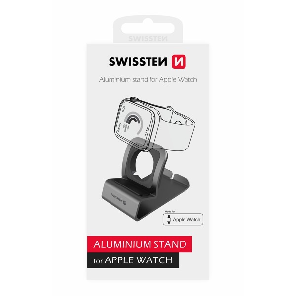 Elegantný stojan z lešteného hliníka pre hodinky Apple Watch. Možno doň vložiť bezdrôtovú nabíjačku. Stojan na hodinky proti poškriabaniu je vybavený protišmykovou podložkou. Kompatibilný so všetkými hodinkami Apple Watch 1-8. Balené v blistri SWISSTEN