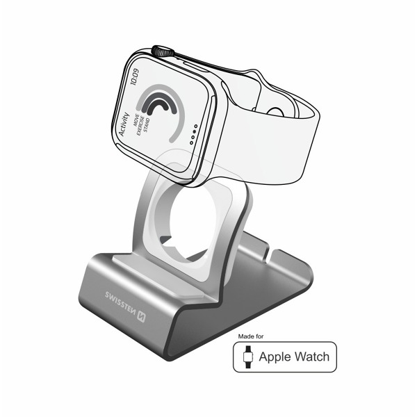 Elegantný stojan z lešteného hliníka pre hodinky Apple Watch. Možno doň vložiť bezdrôtovú nabíjačku. Hodinky sú vybavené protišmykovou podložkou proti poškriabaniu. Kompatibilný so všetkými hodinkami Apple Watch 1-8. Balené v blistri SWISSTEN