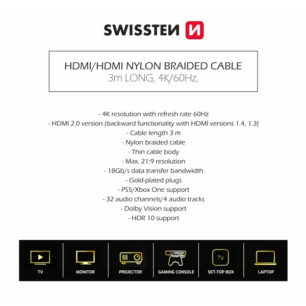 Hľadáte kvalitný opletený kábel HDMI, ktorý bude prenášať obraz so zvukom z vášho zariadenia a v kvalite 4K s obnovovacou frekvenciou 60 Hz? Našli ste ten správny! Kábel HDMI Swissten je skvelou voľbou na prenos akéhokoľvek druhu videa a zvuku pomocou rozhrania HDMI 2.0, ako aj 4 zvukových stôp a 32 zvukových kanálov. Vďaka niekoľkým šikovným funkciám, ktorými disponuje, splní kábel požiadavky prakticky každého zákazníka. Patria medzi ne VRR, HDR, QMS a ďalšie.