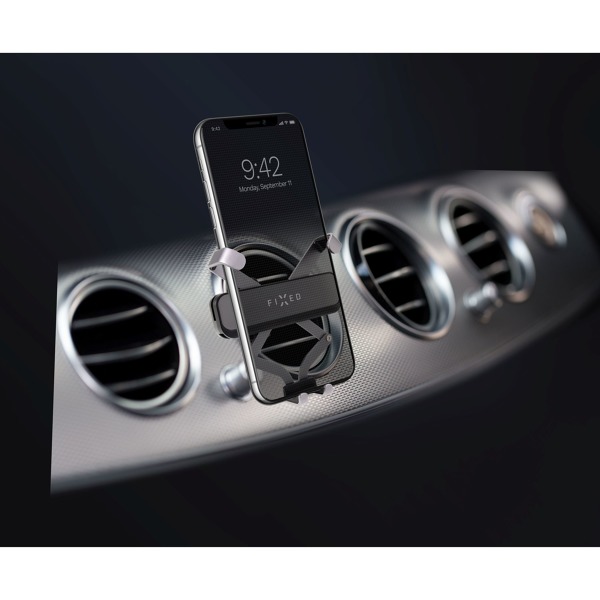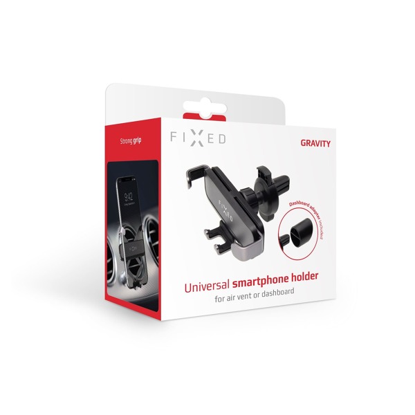 Univerzálny držiak FIXED Gravity je praktický doplnok na pripevnenie mobilného telefónu počas jazdy. Držiak je určený na pripevnenie do mriežky ventilácie, štýlový dizajn v kombinácii striebornej a čiernej farby dokonale zapadne do interiéru vozidla. Vloženie telefónu do držiaka je jednoduché a rýchle, zvládnete ho pohodlne jednou rukou. Vďaka gravitačnému systému uchytenia sa kliešte držiaka zvierajú s hmotnosťou telefónu a bezpečne ho držia. Telefón sa dá rovnako ľahko vybrať. Vďaka otočnému kĺbu môžete telefón v držiaku otáčať tak, aby bol pekne na očiach. Vnútorné polstrovanie klieští držiaka udržiava vložený telefón v úplnom bezpečí. Spodná časť klieští držiaka ponecháva voľný prístup k nabíjaciemu portu telefónu. Súčasťou balenia je aj nástavec s 3M páskou, pomocou ktorého môžete držiak FIXED Gravity pripevniť na palubnú dosku.