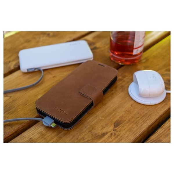 Púzdro FIXED ProFit, vyrobené z pravej hovädzej kože, je elegantným a originálnym doplnkom pre váš mobilný telefón. Chráni ho pred možným poškodením a zároveň poskytuje dostatok priestoru pre vaše doklady, kreditnú kartu a niekoľko bankoviek. Puzdro ProFit je starostlivo navrhnuté tak, aby presne pasovalo na daný model telefónu, vnútorná silikónová vanička dokonale kopíruje tvar zariadenia a ponecháva voľný prístup ku všetkým ovládacím tlačidlám, konektorom a fotoaparátu na zadnej strane. Predná výklopná časť bezpečne chráni displej a je zabezpečená zatváraním na magnet. Po otvorení puzdra nájdete na vnútornej strane dve vrecká na kreditné karty a väčšie vrecko na bankovky.