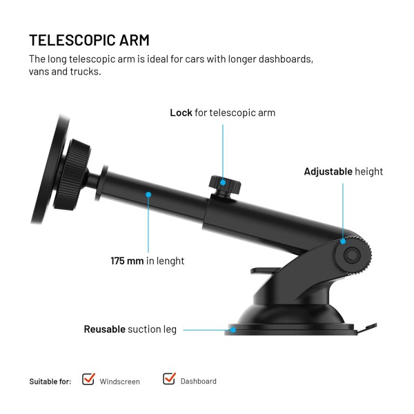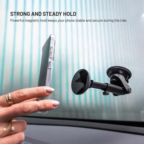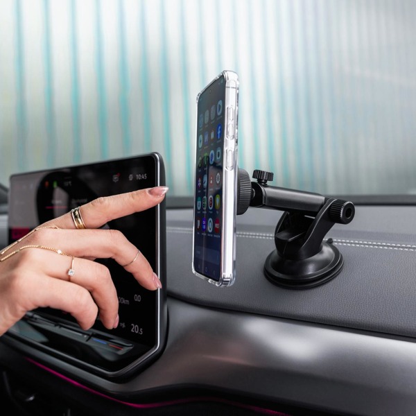 Držiak FIXED MagCircle je elegantné a praktické riešenie na bezpečné upevnenie telefónu v aute s podporou MagSafe. Vďaka silným neodymovým magnetom drží telefón pevne na mieste aj pri jazde cez nerovnosti a jeho pripevnenie je otázkou okamihu - stačí ho zacvaknúť a vyraziť. Ovládanie jednou rukou zaručuje maximálne pohodlie pri jazde. Držiak sa pripevňuje pomocou silnej prísavky na palubnú dosku alebo čelné sklo, čo zaručuje stabilné uchytenie bez vibrácií. Teleskopické rameno sa dá vysunúť až o 17,5 cm, takže si polohu telefónu ľahko prispôsobíte presne podľa svojich potrieb. Otočný kĺb umožňuje nastaviť ideálny uhol pohľadu na navigáciu a hands-free hovory. Predný povrch z tvrdeného skla dodáva držiaku prémiový vzhľad a zároveň zabezpečuje hladký kontakt s telefónom. Minimalistický dizajn vyvinutý v Českej republike dokonale zapadne do interiéru každého vozidla.