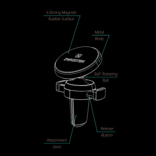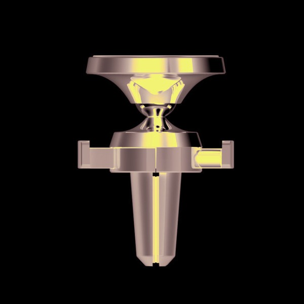 Metalický magnetický držiak do auta v elegantnom dizajne. Je vybavený štyrmi magnetmi pre lepšie zabezpečenie telefónu. Pogumovaný povrch chráni telefón pred poškriabaním a zabraňuje možnosti vykĺznutia telefónu. Záves zabezpečuje možnosť otáčania v požadovanom smere. Pružiny v čeľustiach zabezpečujú maximálnu pevnosť držiaka vo vetracej mriežke. Balené v blistri