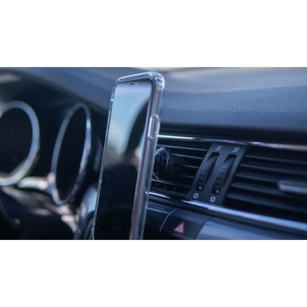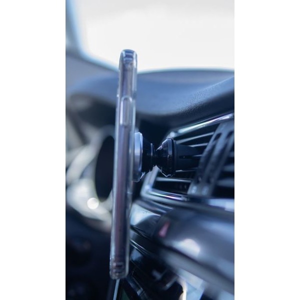 Metalický magnetický držiak do auta v elegantnom decentnom dizajne. Je vybavený šiestimi magnetmi pre lepšie zabezpečenie telefónu. Pogumovaný povrch chráni telefón pred poškriabaním a zabraňuje možnosti vykĺznutia telefónu. Záves zabezpečuje možnosť otáčania v požadovanom smere. Pevné uchytenie čeľustí zaisťuje držiak proti vysunutiu z mriežky. Balené v blistri