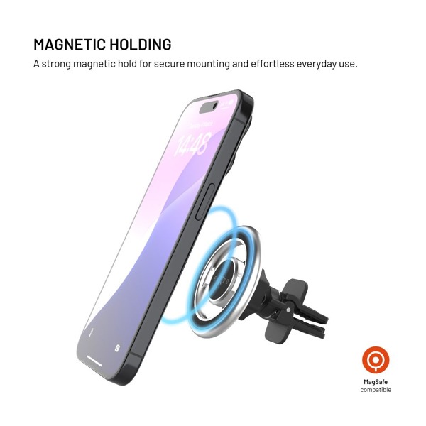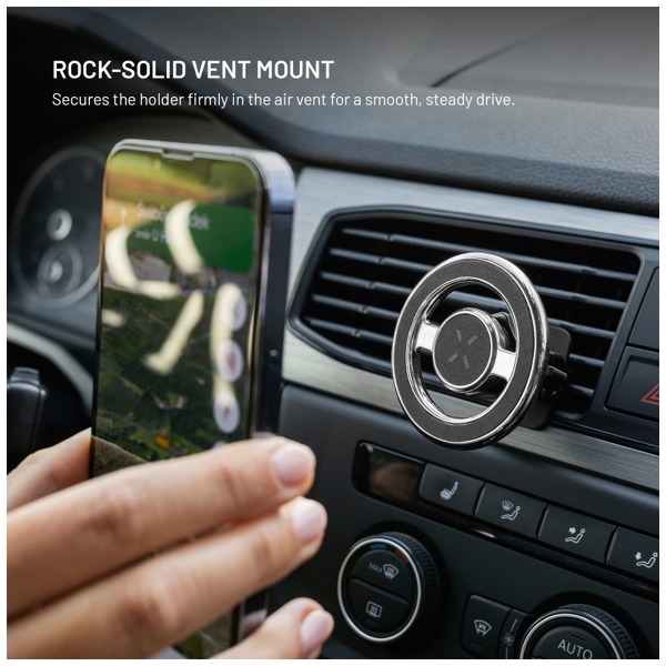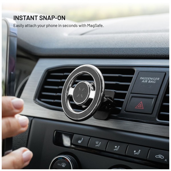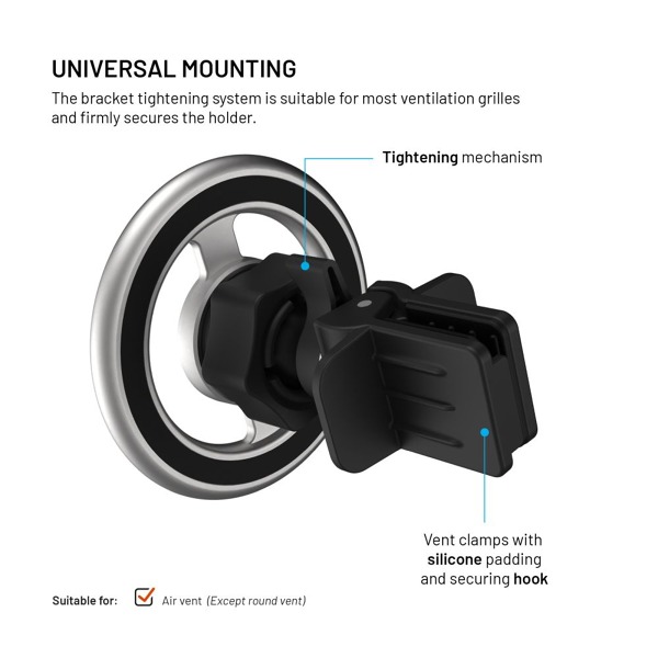 FIXED MagMount je magnetický držiak do ventilácie automobilu určený špeciálne pre iPhony s podporou MagSafe. Je navrhnutý tak, aby sa zmestil do mriežky ventilácie, uťahovacie kliešte na zadnej strane držiaka sú vybavené zabezpečovacím háčikom pre dokonalú stabilitu. Držiak MagMount funguje na jednoduchom a účinnom princípe, po obvode držiaka je nainštalovaných 18 magnetov, jednou rukou stačí priložiť telefón k držiaku a ten bude pevne pripevnený k jeho základni. Ak máte starší iPhone alebo iný telefón bez MagSafe, v balení nájdete špeciálnu magnetickú podložku, ktorou telefón vybavíte na použitie s držiakom MagMount. Držiak bude bezpečne držať váš telefón bez ohľadu na otrasy spôsobené jazdou, čo vám umožní bezpečne a pohodlne používať navigáciu alebo telefonovať. Pomocou otočného kĺbu si nastavte telefón do ideálneho pozorovacieho uhla, aby ste ho mali vždy na očiach. Decentný dizajn v striebornej a čiernej farbe dokonale zapadne do interiéru každého auta.