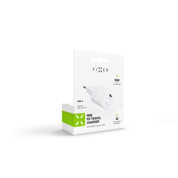 Mini sieťová nabíjačka FIXED s výstupom USB-C a podporou PD, 30 W, biela