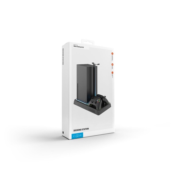 Dokovacia stanica FIXED pre Xbox je základným príslušenstvom na organizáciu herného príslušenstva. Stanica ponúka priestor pre samotnú konzolu Xbox Series X/S, nabíjačku pre dva ovládače a zabudovaný ventilátor, ktorý účinne odvádza prebytočné teplo z konzoly. Nabíjacia dokovacia stanica umožňuje súčasné nabíjanie dvoch ovládačov a je kompatibilná s konzolami Xbox ONE, Xbox Series X, S a Elite. Na rýchle a bezpečné nabíjanie stačí vymeniť bežné batérie za priložené kolíkové batérie. Prostredníctvom kolíkov batérií a stanice sa nabíjanie spustí okamžite po pripojení ovládačov. Špeciálne navrhnuté kryty batérií s výrezmi dokonale zapadajú do ovládača a zabezpečujú tak bezproblémové nabíjanie. Praktický dizajn stanice zahŕňa aj výsuvný držiak na 12 diskov s hrami a odnímateľný stojan na slúchadlá. Štýlové LED podsvietenie celej stanice dodáva hernej atmosfére nový rozmer a možno ho meniť stlačením jediného tlačidla. Stanica je vybavená dvoma portmi USB-A na pripojenie ďalšieho príslušenstva a portom USB-C na pripojenie konzoly k stanici. Súčasťou balenia je kábel USB-C/USB-A.