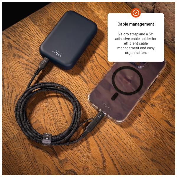 Nabíjací a dátový kábel FIXED 2 v 1 ponúka vďaka konektorom USB-C/USB-C a prídavnému adaptéru Lightning všestranné použitie pre širokú škálu zariadení vrátane smartfónov, tabletov, notebookov a príslušenstva Apple. Certifikácia MFi zaručuje plnú kompatibilitu so zariadeniami Apple a bezpečnú prevádzku. S výkonom až 60 W a podporou technológie Power Delivery 3.0 rýchlo nabijete svoj telefón alebo tablet, zatiaľ čo rýchlosť prenosu dát 480 Mb/s na rozhraní USB 2.0 uľahčí zdieľanie súborov. Na zabezpečenie odolnosti je kábel vybavený odolným textilným opletením s rebrovaným koncom, aby vydržal každodenné používanie. Súčasťou kábla je popruh so šnúrkou na jednoduché prenášanie a samolepiaci organizér umožňuje bezpečné pripevnenie kábla na pracovný stôl alebo do auta.