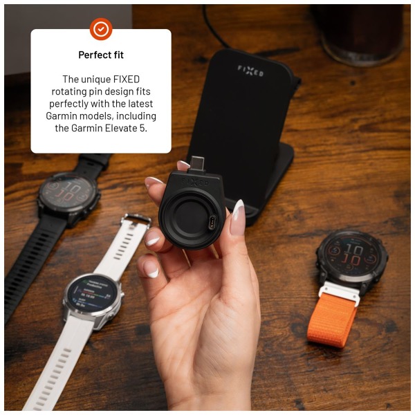 Kompaktný nabíjací adaptér pre inteligentné hodinky Garmin je ideálnym riešením na rýchle a pohodlné doplnenie energie kedykoľvek a kdekoľvek. Adaptér je navrhnutý v jedinečnom dizajne FIXED. Otočný vnútorný krúžok s kolíkmi možno podľa potreby posúvať, aby sa prispôsobil rôznym modelom hodiniek vrátane tých so snímačom Elevate 5. Predĺžený konektor USB-C umožňuje jednoduché pripojenie k nabíjacej stanici FIXED Powerstation Uni, notebooku, telefónu alebo inému kompatibilnému zariadeniu. Stačí pripojiť hodinky a nabíjanie sa okamžite spustí. Praktické príslušenstvo, ktoré oceníte na cestách a pri každodennom používaní.