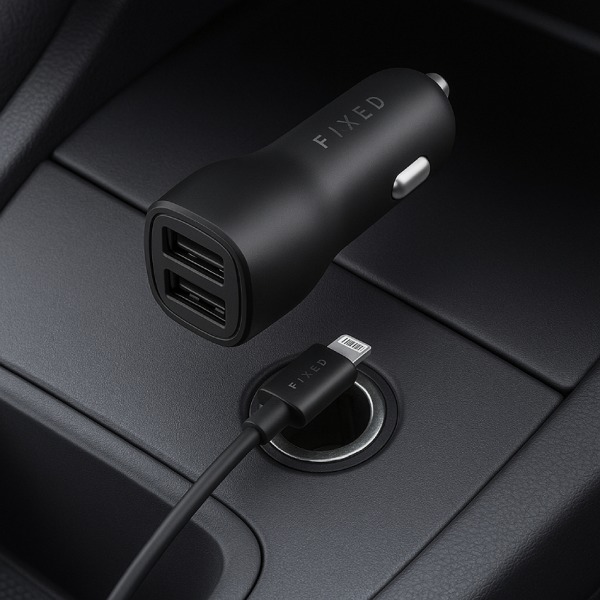Nabíjačka do auta FIXED s výstupom 2xUSB a káblom USB/Lightning, 1 meter, certifikácia MFI, 15W Smart Rapid Charge, čierna