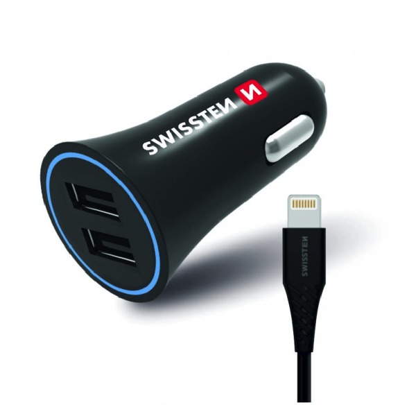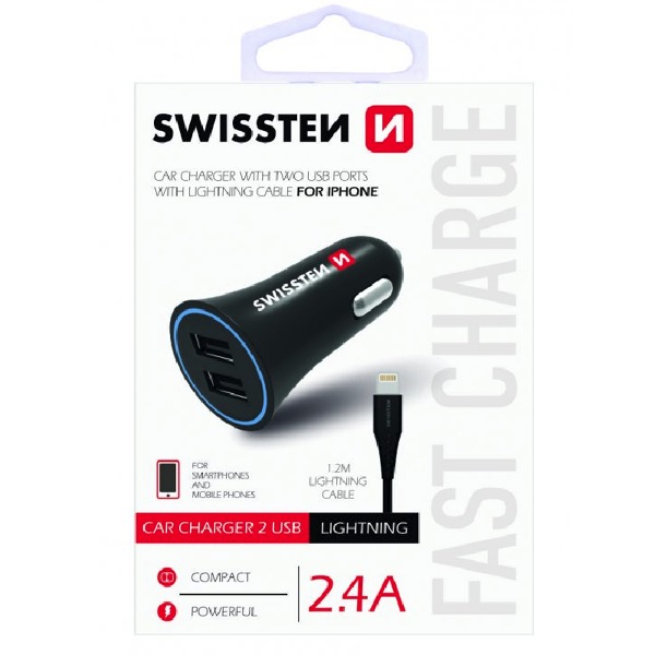 Nabíjačka do auta Swissten 2,4A 2x USB + Apple Lightning nabíjací kábel 1,2 m - čierna