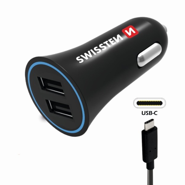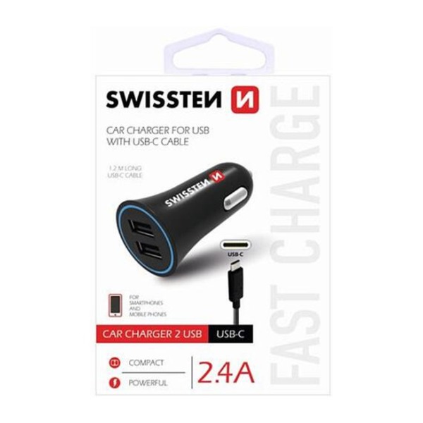Nabíjačka do auta Swissten 2,4A 2x USB + nabíjací kábel USB-C - čierna