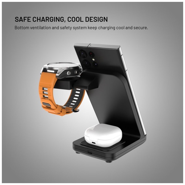 Bezdrôtový stojan FIXED Powerstation pre Garmin ponúka pohodlné nabíjanie až troch zariadení súčasne. Hlavná plocha podporuje rýchle nabíjanie telefónov s výkonom až 15 W a vďaka kombinovanej cievke možno telefón umiestniť do horizontálnej aj vertikálnej polohy. Druhá plocha s výkonom až 5 W je ideálna pre bezdrôtové slúchadlá alebo iné bezdrôtové príslušenstvo. Súčasťou stojana je odnímateľný adaptér pre inteligentné hodinky Garmin, navrhnutý podľa vlastného dizajnu spoločnosti FIXED. Otočný vnútorný krúžok s kolíkmi možno podľa potreby posúvať, aby sa prispôsobil rôznym modelom hodiniek vrátane tých so snímačom Elevate 5. Vďaka rozšírenému konektoru USB-C možno adaptér ľahko pripojiť k iným zariadeniam, ako sú bežné nabíjačky, powerbanka, notebook alebo telefón. Mäkký povrch nabíjacích plôch chráni zariadenie pred poškriabaním, zatiaľ čo protišmykové podložky udržujú stojan stabilný. Na dosiahnutie maximálneho výkonu odporúčame používať napájací adaptér s výkonom minimálne 25 W v štandarde PD. Stojan FIXED Powerstation Stand for Garmin je ideálnym riešením pre každého, kto hľadá praktický a štýlový spôsob, ako mať všetky svoje zariadenia vždy plne pripravené.