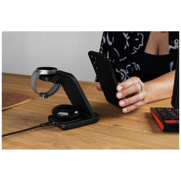 Bezdrôtová nabíjačka v minimalistickom dizajne, ktorá dokáže súčasne nabíjať telefón, bezdrôtové slúchadlá a hodinky. Hlavná nabíjacia plocha s výkonom až 15 W je určená pre váš telefón, ktorý môžete nabíjať vertikálne aj horizontálne, nabíjanie je indikované LED diódou. Sekundárna nabíjacia plocha na základni stojana s výkonom 5 W je ideálna pre slúchadlá TWS, iný telefón alebo iné zariadenie na bezdrôtové nabíjanie. Tretia plocha je vyvinutá špeciálne na nabíjanie hodiniek Samsung Galaxy Watch. Tento adaptér možno odpojiť a pripojiť k iným nabíjačkám pomocou konektora USB-C. Zariadenie Powerstation for Samsung má vstupný konektor USB-C, pre plný výkon musí byť napájané štandardným 25W nabíjacím adaptérom PD. Na spodnej strane stojana sú silikónové nožičky, ktoré celý stojan pevne udržia na stole. Stojan má zabudovanú ochranu proti skratu, prepätiu a prehriatiu.