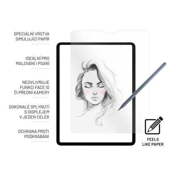 Ochranné sklo FIXED PaperGlass Screen Protector so špeciálnou vrstvou imitujúcou povrch papiera dokonale ochráni displej vášho iPadu a zároveň poskytne prirodzený pocit pri práci so stylusom. Vďaka sklu sa vyhnete nešťastiu v podobe škrabancov či prasknutého displeja a budete mať istotu, že dotyková obrazovka vášho zariadenia bude dlho a spoľahlivo slúžiť. Špeciálny jemne zdrsnený povrch skla zabezpečuje presnú odozvu displeja, takže písanie a kreslenie s ceruzkou Apple Pencil alebo inými stylusmi bude rovnako prirodzené a isté ako na tradičnom papieri. Sklo dokonale priľne k celému povrchu displeja vrátane zaoblených hrán. Takisto neprekáža selfie kamere ani odomykaniu pomocou Face ID. Matný antireflexný dizajn navyše zabraňuje nepríjemným odrazom svetla na displeji tabletu. PaperGlass Screen Protector je ideálny doplnok pre všetkých skicárov, grafikov a častých zapisovateľov poznámok; vaše náčrty a písaný text budú na iPade vyzerať rovnako prirodzene ako na tradičnom papierovom zošite. Sklo je kompatibilné so všetkými bežnými puzdrami a klávesnicami pre iPad. Súčasťou balenia je všetko, čo potrebujete na jednoduchú a rýchlu inštaláciu.