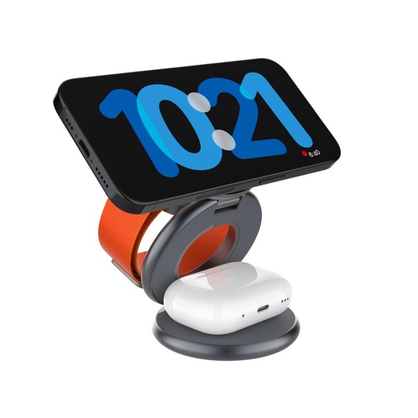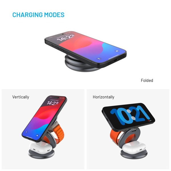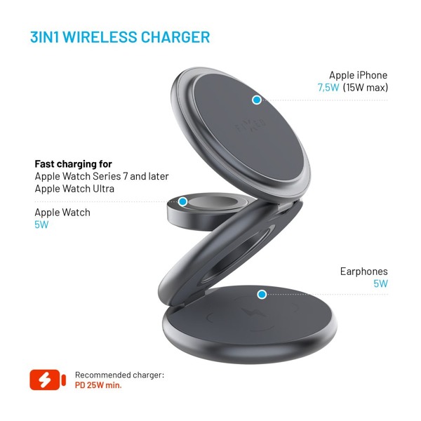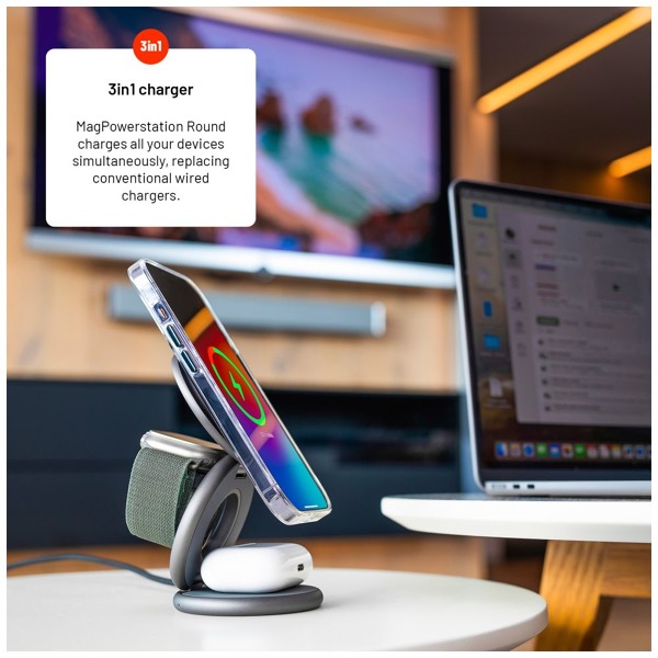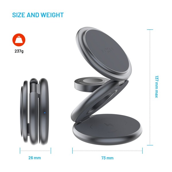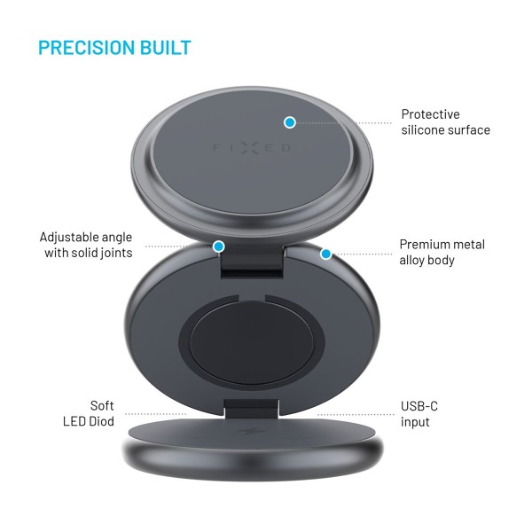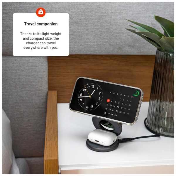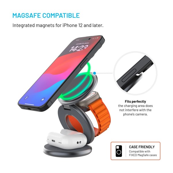 Kompaktná bezdrôtová nabíjačka FIXED MagPowerstation Round s podporou MagSafe je ideálnou voľbou na nabíjanie až troch zariadení súčasne. Hlavná nabíjacia plocha s magnetmi MagSafe pevne pripevní iPhone radu 12 a vyššie, či už vo vertikálnej alebo horizontálnej polohe, a okamžite spustí bezdrôtové nabíjanie s výkonom 7,5 W. Vyvýšený povrch je navyše presne prispôsobený tak, aby nezasahoval do fotoaparátu telefónu, čím je zaistené jeho bezpečné pripevnenie a nabíjanie. Telefóny iných značiek možno nabíjať výkonom až 15 W. Druhá plocha slúži na nabíjanie bezdrôtových slúchadiel a integrovaná výklopná plocha je určená pre hodinky Apple Watch. Telo nabíjačky je vyrobené z odolnej kovovej zliatiny so silikónovými prvkami, ktoré chránia nabíjané zariadenia pred poškriabaním. Vďaka nastaviteľným kĺbom možno nastaviť ideálny uhol stojana, aby pevne držal vo zvolenej polohe. V zloženom stave je kompaktná veľkosť ideálna na cestovanie, pričom hornú plochu môžete stále používať ako nabíjaciu podložku. Nabíjačka je vybavená vstupným konektorom USB-C a na plný výkon vyžaduje minimálne 25W štandardný zdroj napájania PD.
