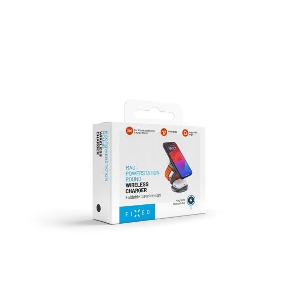 Okrúhla bezdrôtová skladacia nabíjačka FIXED MagPowerstation 3v1 s podporou MagSafe, 15W+5W+5W, sivá