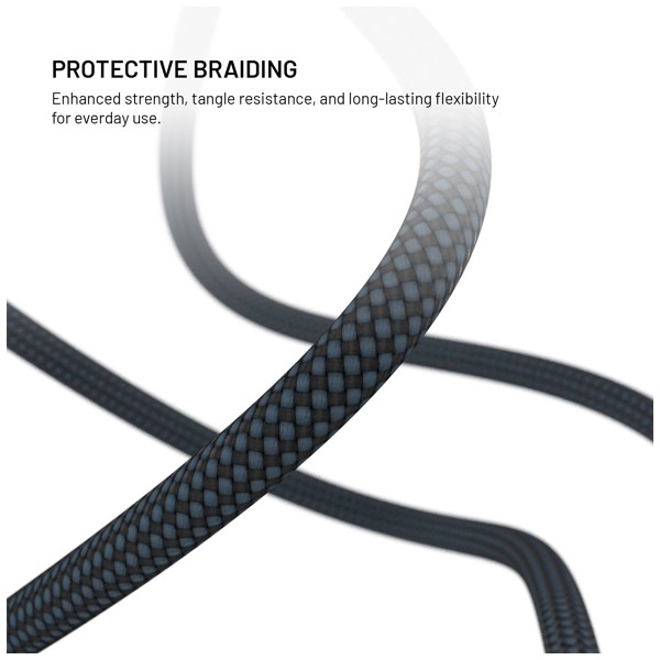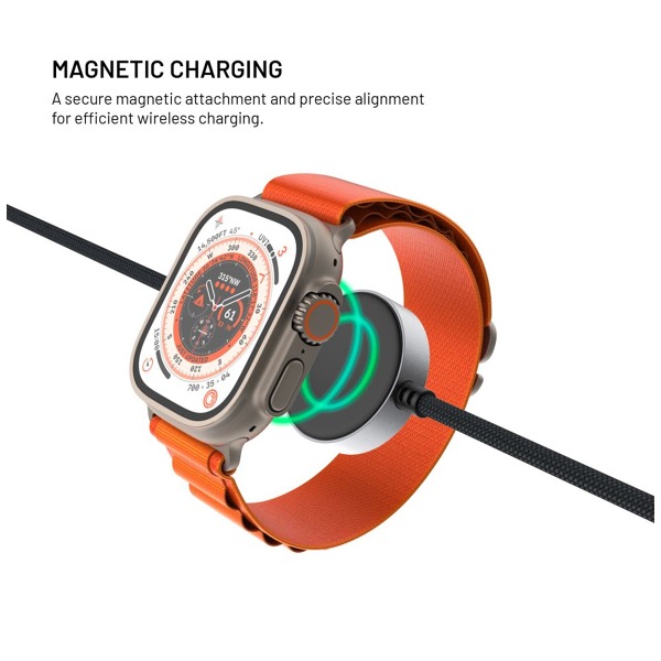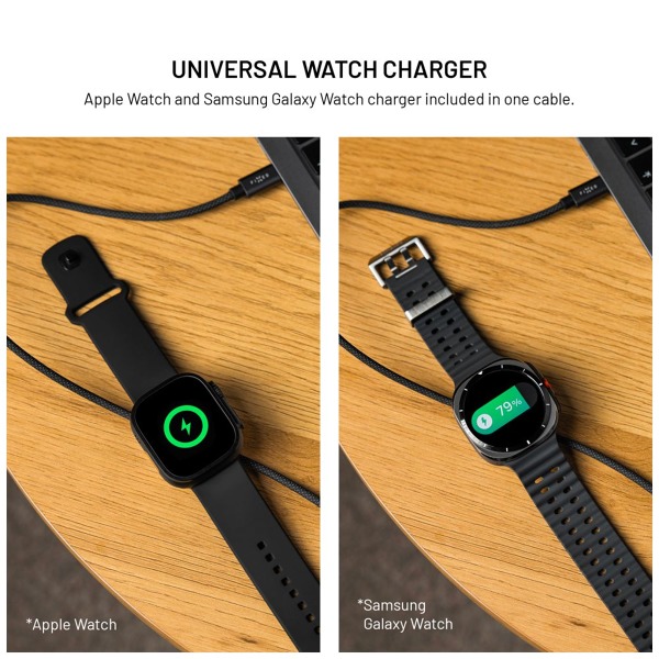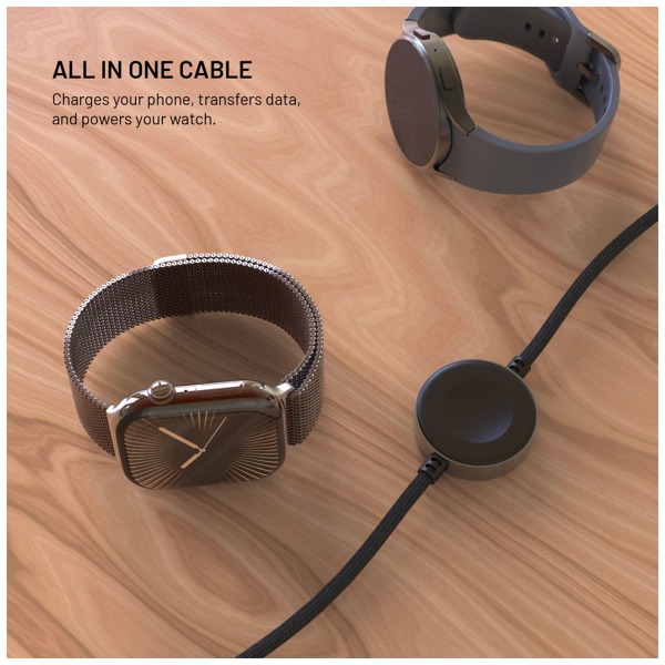 Celková dĺžka kábla je 1,5 m – 30 cm vedie od konektora k nabíjacej ploche pre hodinky a zvyšných 120 cm pokračuje k druhému konektoru. Opletený dizajn zvyšuje odolnosť voči opotrebovaniu, zatiaľ čo precízne spracované hliníkové koncovky a telo nabíjačky zaručujú dlhú životnosť. Kábel podporuje aj prenos dát rýchlosťou až 480 Mb/s.