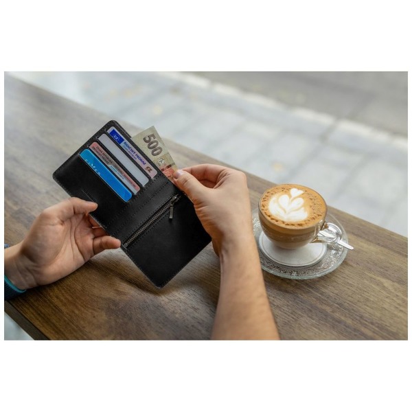 Luxusná peňaženka ručne vyrobená z najjemnejšej hovädzej kože, do ktorej sa pohodlne zmestia všetky vaše doklady a karty. Vo vnútri nájdete 4 vrecká na kreditné karty, veľké vrecko na bankovky, vrecko na mince uzatvárateľné zipsom a vnútorné skryté vrecko vhodné na hodinky alebo technický preukaz.