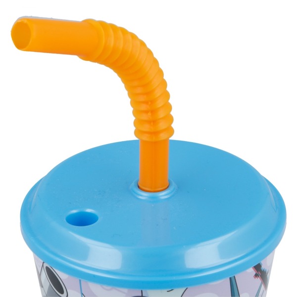 Hrnček je vybavený pevným viečkom, ktoré zabraňuje rozliatiu, a integrovanou slamkou, ktorá uľahčuje pitie. Vďaka ľahkému plastovému materiálu sa ľahko prenáša, je odolný a vhodný na každodenné používanie.