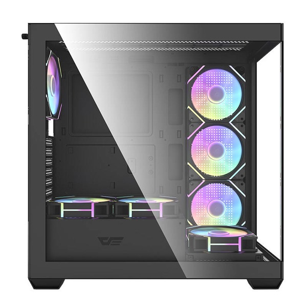 Darkflash DS900 je moderné riešenie pre náročných používateľov, ktorí si cenia estetiku aj funkčnosť. Vďaka nápadnému čiernemu panoramatickému dizajnu bez A-stĺpika s dvoma plne priehľadnými sklenenými stenami nielenže pôsobivo vyzerá, ale poskytuje aj vynikajúcu viditeľnosť komponentov. Skriňa je navrhnutá tak, aby poskytovala optimálne chladenie, výkon a všestrannosť, pričom ponúka jednoduchú úpravu a rozšírenie počítačových systémov. Zostava je vybavená 7 120 mm ventilátormi ARGB.