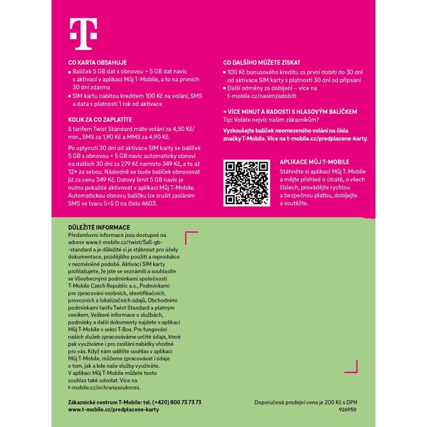 Balíček obsahuje kredit 100,- Kč, 5GB dát + 5GB v aplikácii Môj T-mobile + 100Kč na dobitie do niekoľkých dní. Volania 4,50 Sk/min, SMS 1,90Kč a MMS 4,90 Sk.